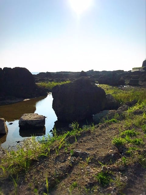“岩場 怖ぁ~い。 きゃあ!波高ぁい! 虫~!”